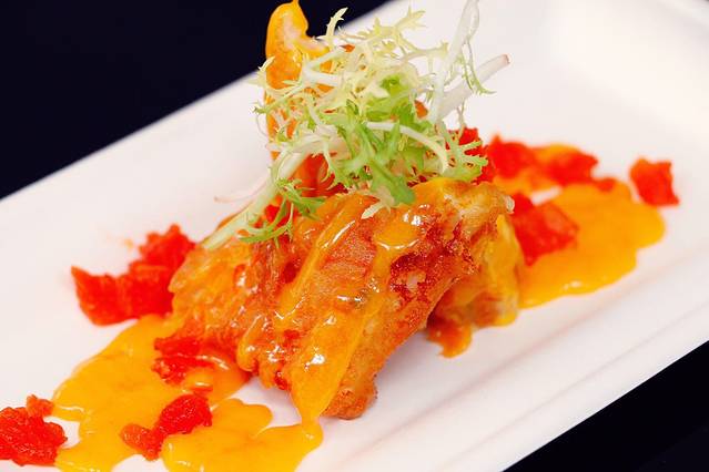炸红虾搭配烤番茄,一口咬下,香脆可口,虾仁弹牙爽嫩,伴随着蜂蜜芥末酱,口感层次丰富。