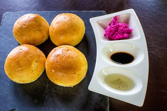 餐前小点是小面包,嘿,这么普通的小面包,这样就上桌啦!好面包要配好酱料嘛,这酱三个酱就厉害了,第一个是用新鲜的紫甘蓝叶做成的酱泥,第二个是西餐万能醋-黑醋,第三个则是又香又健康的橄榄油,三个口味任君选择,呃,还多出一个面包用什么酱?那就不用酱,原味经典。