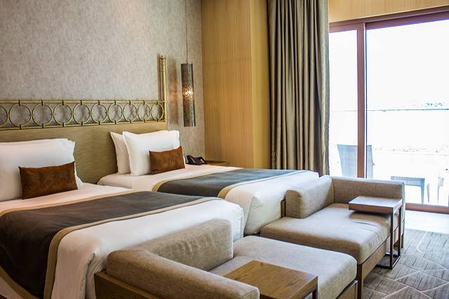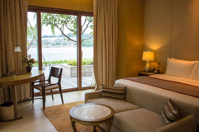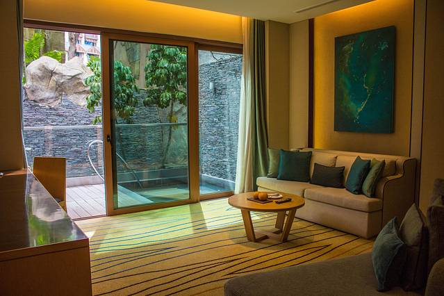 在最近的《我们相爱吧》郑恺和他的女友一起到访了新加坡圣淘沙名胜世界的海景套房,出看二楼的客厅与阳台,都比较普通,没有什么特别之处。但是走到一楼的房间里,打开幕帘子,眼中所看到的景象,一定会让人连连叫“哇”。