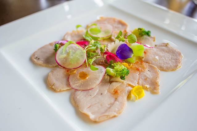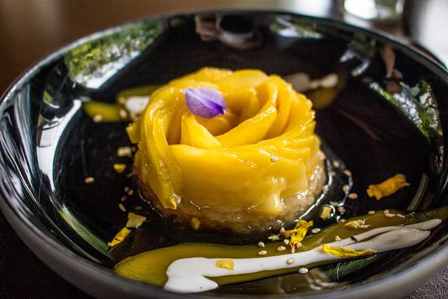 泰式猪肉片是泰餐中经典菜肴之一。65℃真空低温烹调的猪脊肉,搭配脆口的小红萝卜和花椰菜,酸酱汁酸酸辣辣的口感,吃下去给脑袋传达到的信息就是:清新,清新,好清新,猪肉片几乎没有一点点油腻的感觉,清新到让我觉得可以一个人吃下十盘。