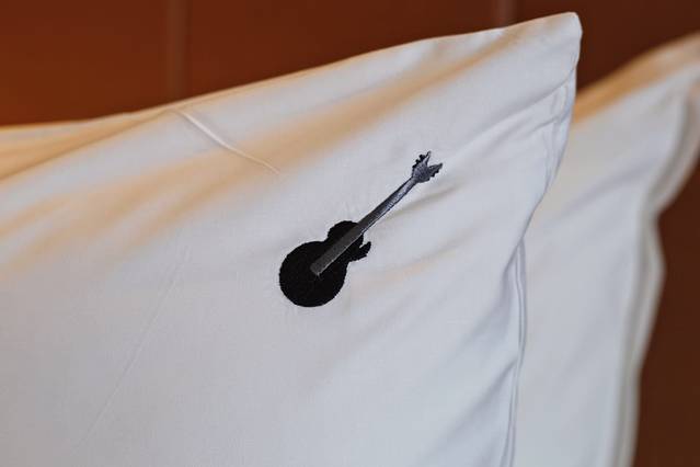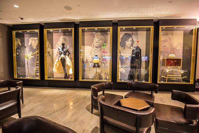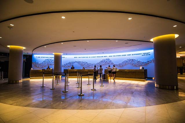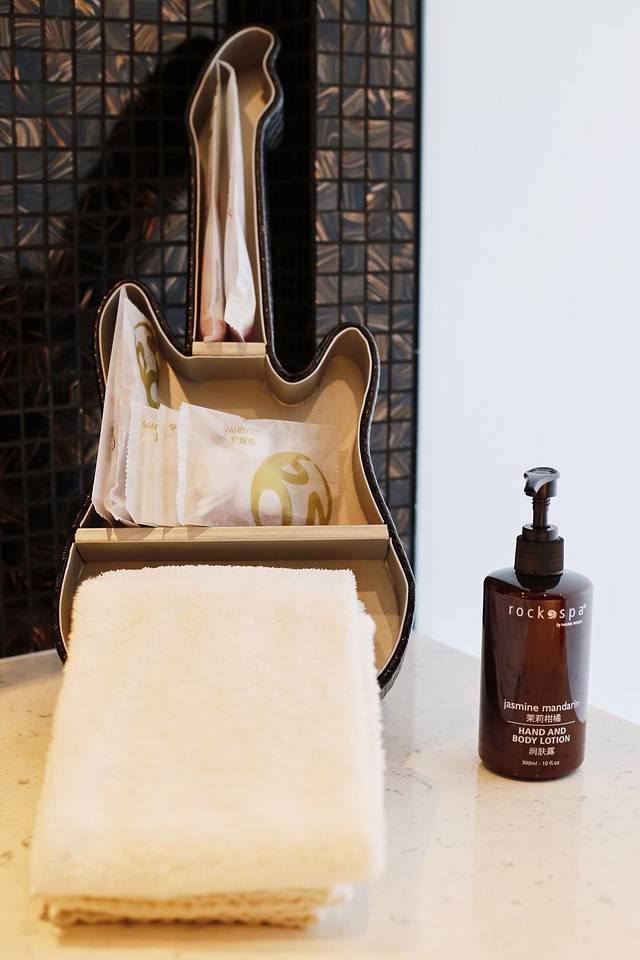 刚抵达新加坡圣淘沙名胜世界Hard Rock酒店,一把很大的电吉直接闯入视线,吉他刮片装饰布满前台的背景墙,随着墙灯变化的颜色而闪耀夺目。酒店的各个地方展示着很多摇滚明星曾经穿戴过的演出服装和饰品。