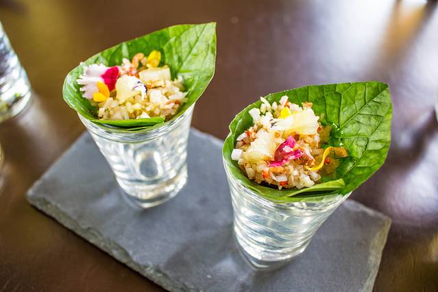 这道野生胡椒叶搭配泰式香料,刚上桌,就被这独特的外形所吸引,如装饰品一样清新美艳。吃饭也是比较独特,“一口闷”,嘴巴不够大怎么办,放进嘴里捂着嘴“闷”,一定要这样的吃法,才能吃出它特别的口感,完全属于东南亚的味道,香叶包裹着各种磨成小碎末的香料,棕榈糖和核桃仁让它口感更多了一个层次。