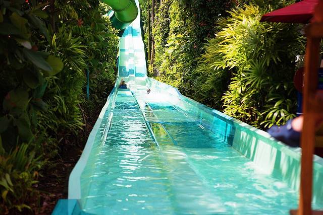 抓紧手中的浮垫,顺着飞跃极限花道急速下滑,在惊险的骤降和颠簸中,得到无限快感。
