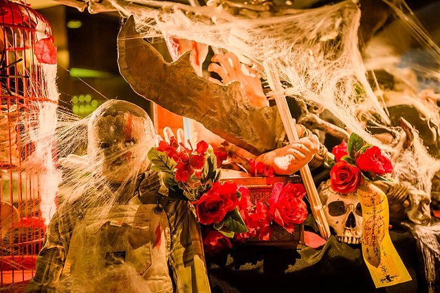 血色白蜡烛、骷髅头、灵符等元素,加上昏暗的灯光,让恐怖气氛更加浓郁。