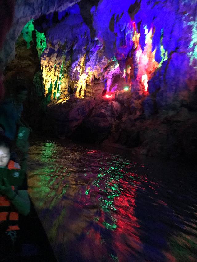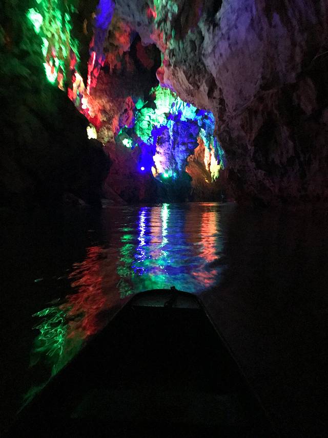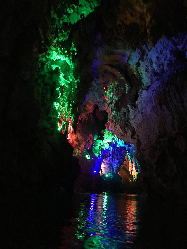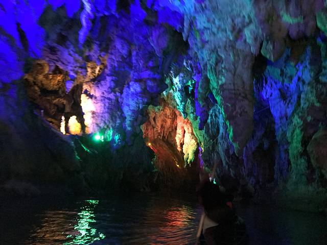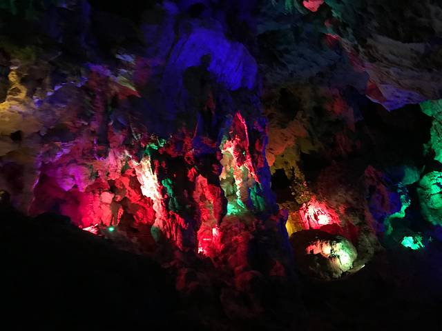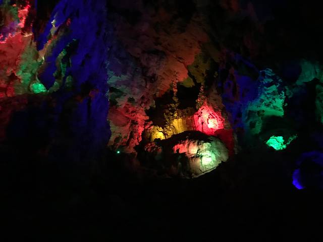 石钟乳和石笋在彩灯的照耀下很漂亮