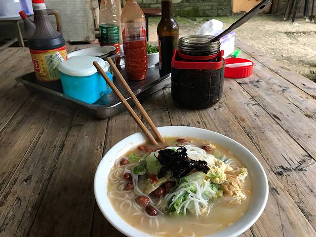 清早起来,客栈煮了一碗米线,不是炸酱的,是白菜鸡蛋米线,还有鸡枞油呢。