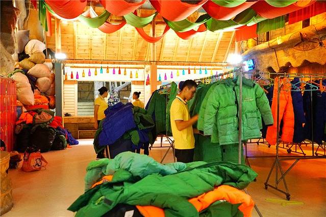 凭冰雪世界的门票可以免费领取棉服,如果觉得耳朵和腿会冷的话,可以花上十块钱在旁边的小店铺租上一套耳朵帽和腿套。