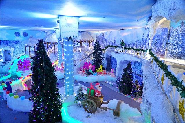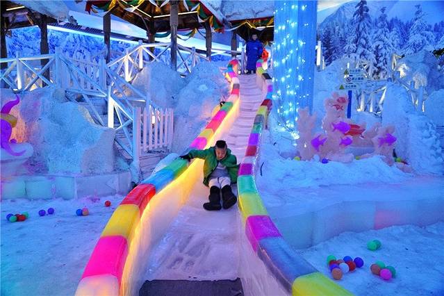 三亚宋城旅游区位于三亚市迎宾路333号,建有三亚千古情景区、三亚宋城彩色动物园、三亚宋城冰雪世界、三亚宋城浪浪浪水公园等主题公园,以及三亚宋城云曼房产、三亚宋城云曼酒店等配套设施。我们现在来的三亚宋城冰雪世界主要由北欧乡村小镇、冰原魅影、冰窟魔音、滑冰道、滑雪场、冰雕观赏区、戏雪区等主题区和配套项目构成。其中北欧乡村小镇通过暗藏的LED灯的设计、乡村风情小木屋、雪松营造童话风情,而滑冰道、滑雪场、冰雕观赏区、戏雪区等区域则利用冰雕装饰和参与性极强的冰雪运动,在四季如夏的鹿城打造冰与火的气候反差。