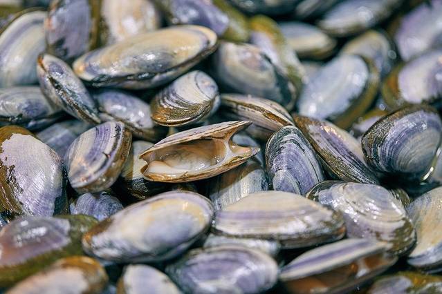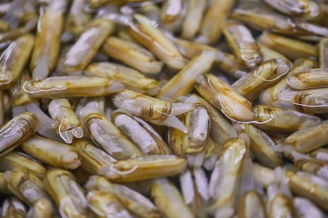 海鲜摊位前,生蚝被堆成了小山模样。个子大大的蛏子被被扎成一捆捆的卖,用手戳一下一下每个蛏子头都会动,非常新鲜。各种贝类都被洗干净,分门别类放在不同的塑料箱里。