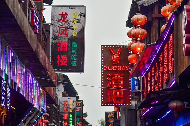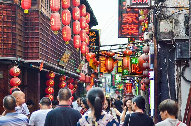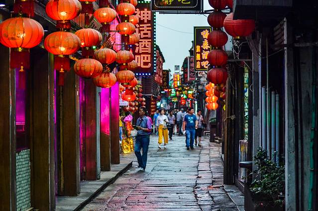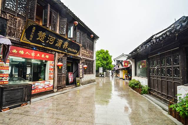 到了夜晚,可以在很大街道上看到大大小小店铺门前的灯笼,在灯笼红润之光的照射下让斑驳的墙壁显得更具有古色的气息。一条大运河将繁花似锦的烟雨长廊与西街精致而巧妙的分割开来。在灯火辉煌之下,让这条古运河彰显了几千年都不曾退化的繁荣、昌盛与热闹。