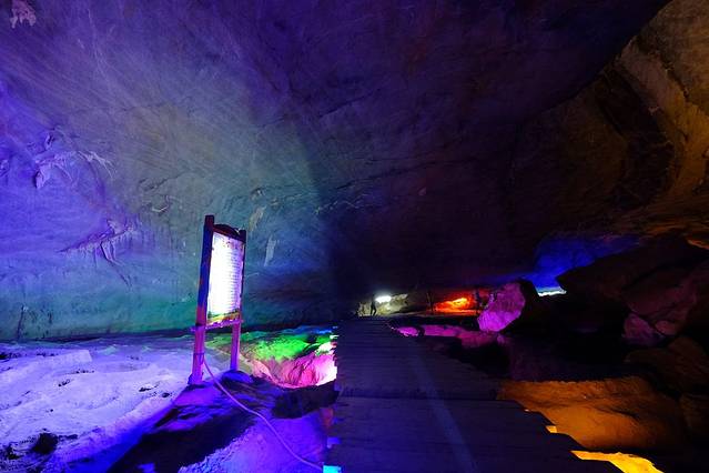 经过近1小时车程,就到了燕山景区了。是个天然的大溶洞,里面空间很大,既有奇形怪状的钟乳石,也有不小的地下河,景观还是很不错的,但缺乏开发力度,据说山洞里面有燕窝采,看洞里顶上插有很多长长的竹杆,就是采燕窝用的,也不知道怎么用,因为不见有人现场开采。景区内游客很少,LP说,这样更好,她最不喜欢人多。洞内光线不足,灯光真的太少,设施很简陋,几乎是能省的都省了,这是我到此为止游历过的最简陋的一个景点了。不禁感叹,山区的景点建设真的不能与珠三角的比!相对的,门票有点贵了。