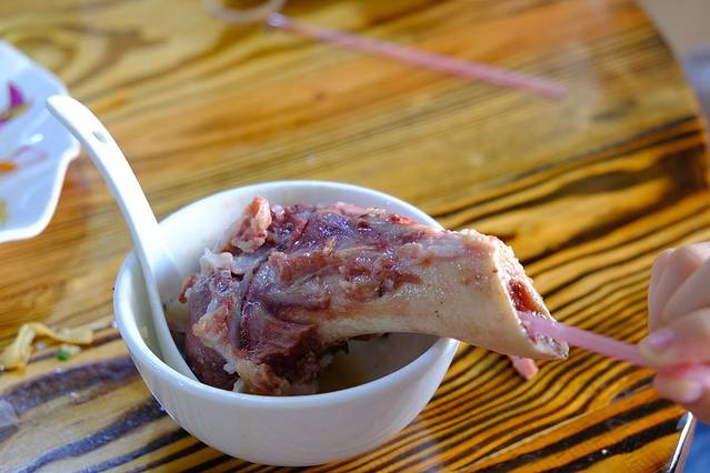 早上起来吃早餐,就去街上找昨晚饭后才看到的筒骨粥小店。10元一碗,很大的一块猪骨加粥,用条吸管吸骨里面的骨髓,颇为新奇。LP直言很正点!