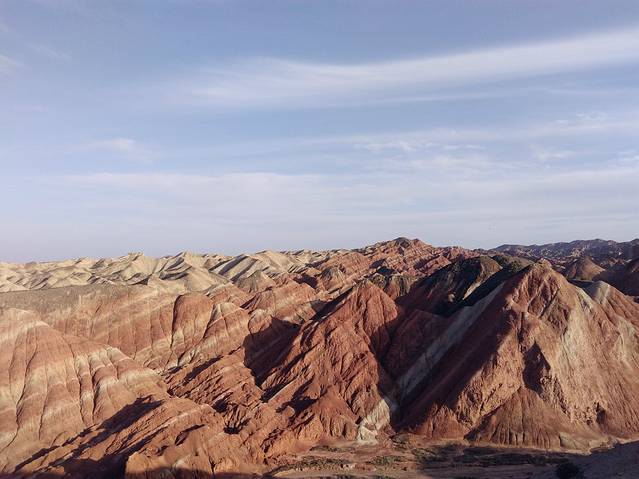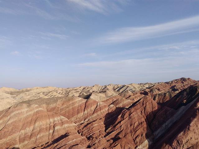 七彩丹霞,果然名不虚传,即便没踏上观景台我也足以被震撼,这是一种无需雕饰的自然美,群峰林立,组合有序,富有韵律和层次。它的山崖,远看似染红霞,近看则色彩斑斓,许多峭壁,像刀削斧辟,直指蓝天,景色相当瑰丽。我曾以为张掖的丹霞的确美,但那些动人心魄的图片有可能都是后期修片而成的。可当走过这里,站在观景台向远眺望,山峰沟壑被染成片片黛青色、暗褐色、丹红色……七彩斑斓,在蓝天白云衬映之下,和谐中产生那种强烈的视觉冲击,真是色如渥丹,灿若明霞,构成一幅幅多彩的画面。照片下的丹霞,真是连真实景色的百分之一都不及,如今以游记的形式用文字来回味七彩丹霞的美,语言蛮匮乏的,找来找去也仅有两个字“震撼”能够匹配初眸那种惊叹。气势磅礴、场面壮观、造型奇特、色彩斑斓,面对大自然的鬼斧神工,我除了惊奇便是感叹。这样交错的线条、绚烂的色调、壮美的画图,是得上帝多眷顾才能形成这样一个彩色童话世界啊。
