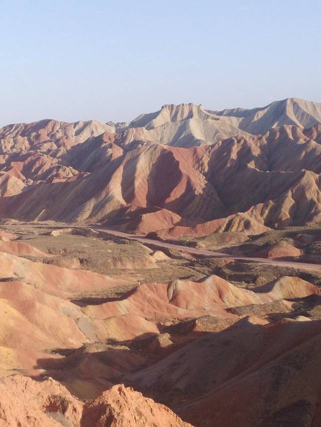 当天边的太阳渐渐跌落,余辉撒在丹霞地貌上,颜色逐渐变得鲜艳、生动,随着光线的推移瑰丽似火的景色又归于质朴,当太阳完全隐于山后,景致变得沉稳而内敛,这一切都在昭示着它的自然之美,各种角度拍了好多张照片,可出现在相片里的景色却大同小异,照片只能看到美,却看不到内涵。带着满足、不舍挥别四号观景台,下山的路比上山顺畅一些,即使太阳隐落,还是抵挡不住人们游性的乐趣,人头攒动的人群中的每个人其实都是我,都是时刻在路上的行者。