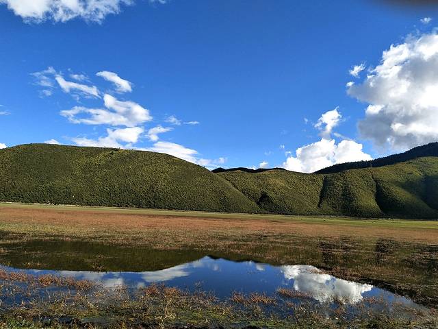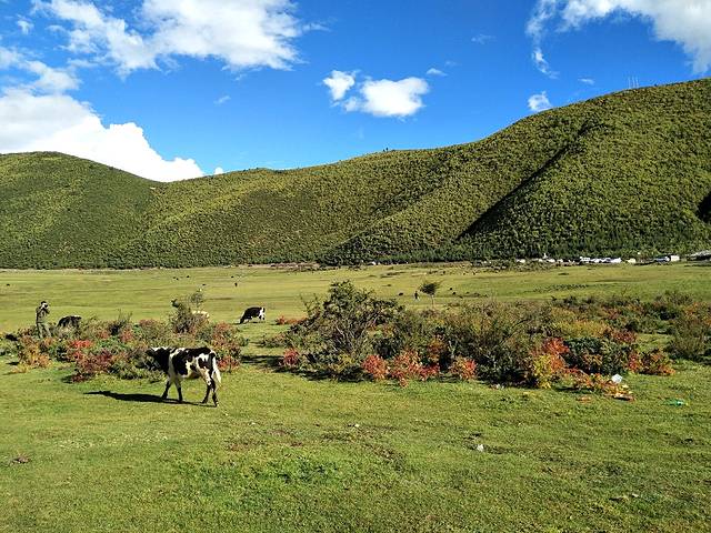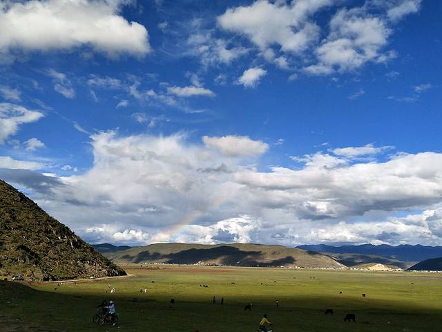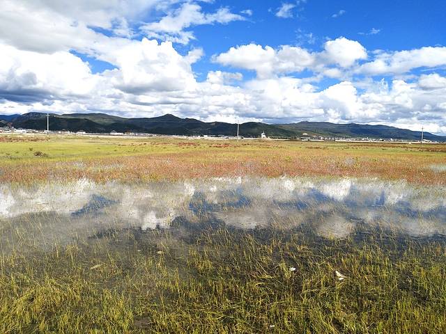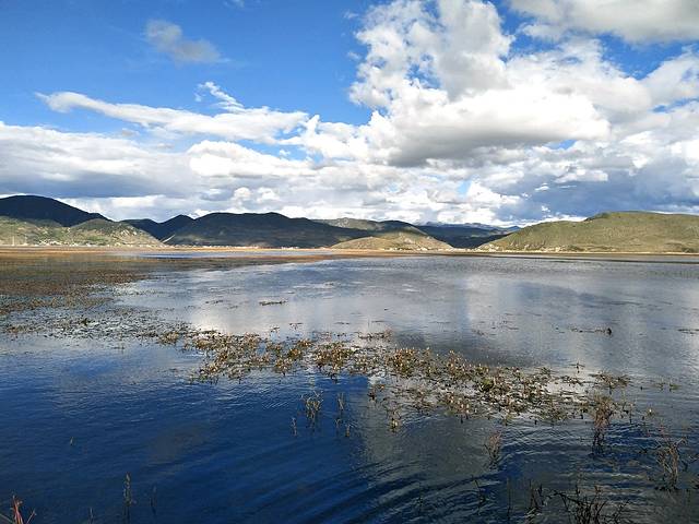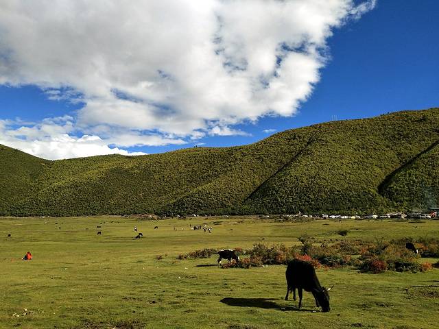 车子沿着金沙江经过虎跳峡,随着从白族建筑风格建筑变成藏族建筑,距离香格里拉更近。下午15时30分左右,经过5个小时车程,终于到达魂牵梦绕的香格里拉。下车后我们跟那三位小伙伴各奔各自预定的酒店。因现在已经是下午,不能去太远的地方,可是又不想浪费这半天时间,我们问旅店老板娘附近有什么好玩。老板娘介绍我们去纳帕海骑电瓶车环湖,而且要走石卡雪山方向,这样就不用收费。于是我们放下行李就出去觅食然后去纳帕海。香格里拉是藏族人居住的地方,客栈附近基本都是藏食餐馆,但也有重庆餐馆,我们走到独克宗古城区附近方尝试了一下藏式米线。吃了东西后,走到古城步行街,遇到了刚刚一起坐顺风车的三位小伙伴们,他们正在寻求能租赁电瓶车的店铺去纳帕海,但因为黄金周,基本所有的电瓶车全已经被出租出去。于是我想起刚才一当地卓玛(女人)问我们去不去纳帕海,于是我们五人找到那卓玛,以优惠价格包车方式前往纳帕海,听着车内播放奔放的藏语歌曲,经过美丽的伊拉草原,然后环纳帕海转了一圈,感觉我们在拍电影,我们都是电影里的主角,让我们的热情开始沸腾。香格里拉,有着蓝天、白云、碧草、蓝海,难怪被誉为离天堂最近的地方。伊拉草原下雨是就是纳帕海,纳帕海湖水干枯就是伊拉草原。我们来到香格里拉的季节,虽然不是最美的季节,没有满山的格桑花,但我们已经感觉非常非常的美丽,沉醉在这景色中。我随便拍的照片,朋友们都惊讶照片是不是经过修图,如此美丽,还把照片换成手机屏保。在那样的天堂美景,随便拍,任何人拍,照片都如此好看,真的美到不敢相信自己眼睛看到的景色。