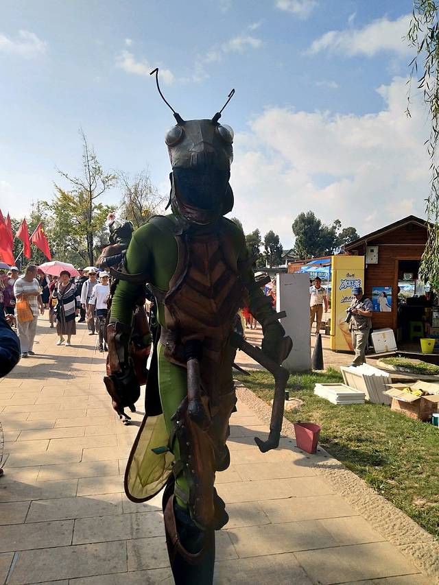 这次旅程最后一天,我们已经习惯早起的节奏,一早起来骑50分钟共享单车前往滇池大观公园,刚好遇到大观公园有菊展,就进去走走。大观公园能看到滇池,还能租船游滇池,国庆节期间园区每天上下午有表演,也有园区街头巡演,好多老人家在散步,还有老人家在动漫模仿的牌子拍照,老人家有着一颗童真的心,自己跟老伴拍完然后互看大笑。我们假装是当地人一般,慢悠悠地边散步边拍照,还跟街头表演艺人亲密接触,正确说我是被那艺人吓到跳起来,我在偷拍时,那艺人突然踩着高跷跳到我面前,我被吓到,可能看到我被吓一跳,艺人还轻抚我的头发,好像是在安慰我,可是被吓到完全忘记要合拍了,而且艺人的造型不知道是苍蝇还是草蜢,我觉得太吓人了。这让我闺蜜笑话我,我闺蜜比我的尖叫声吓到。