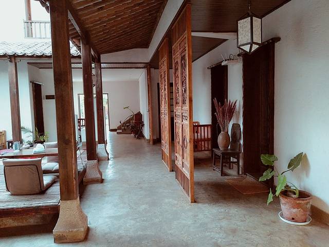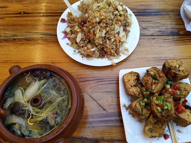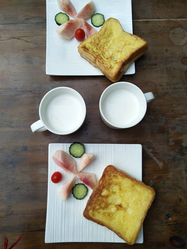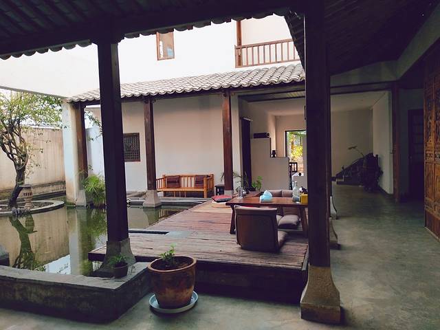 早上8时我们迫不及待就起来,因我们到客栈时间过早,在早起的时刻才有机会好好参观一下这暂时栖息的地方。客栈坐落在三塔公园附近的巷子里,保留着大理白族建筑风格,古色古香,没有空调却冬暖夏凉,正门进来左手边是一个八仙桌,供客人休息,右边是客栈前台,向前走几步左转右手边是楼梯,直走是室内休息平台,在我们那叫这天井,这是位于室内建筑中心,顶层铺盖的是玻璃窗,正中央放着榻榻米,前面一小池子还有一棵花树。走到这里的时候,一只胖胖的狗狗(客栈的宠物)突然从角落出现,瞪着无辜的大眼睛,非常好奇,可能知道我们是客人,自行走到我们前面带路。跟着可爱的狗狗穿过摆着放着各种各样的旧物摆饰的走廊,来到宁静的庭院。庭院有长方形的亭子,有开着几朵亭亭玉立莲花的水池,有在忙碌准备营业的餐厅,非常舒适的庭院。可爱的导游带我们走到餐厅就不愿走了,我们觉得也饿了,就离开庭院走回楼房内点早餐。在点餐的时候,向客栈的老板娘打听这附近有什么好玩的景点,虽然之前有做攻略,但还是想听听当地人的介绍。老板娘跟我们介绍了好多地方,向我推荐了包车服务,一天内想去哪就让司机师傅带我们去哪,也介绍了部分消费可以砍价如骑马。原本我们计划是租辆小电瓶车逛洱海、喜洲、双廊,所以没有马上同意老板娘的推荐。我们走到了天井的榻榻米等待着早餐,就开始发朋友圈聊聊天。客栈提供收费的早餐,有中式的也有西式的,而且出品很漂亮,我们点了西式早餐,我朋友觉得不是很对她口味,或许因为我去的旅游地方比较多,大部分食物味道我都可以接受,或许我是真饿了,这客栈的早餐我觉得不错。