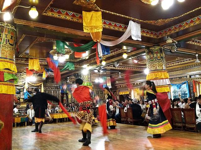 这司机师傅也给我们介绍当地的景点之类的,我们问的,师傅都一一回答。还给我们介绍了藏族土司盛宴,土司是当地人以前对地主的叫法,意思是享受着地主对客人的盛宴,任吃任喝任玩,还有跳舞及篝火晚会。我们一致同意去感受当地的盛宴。师傅说盛宴还没开始,让我们先去独克宗古城转转,过40分钟再来接我们,师傅就让我们下车,可是我们包车的费用还未支付,师傅居然没有一丝丝的怀疑我们会跑单,把我们放下后就离开,完全不催我们付款。随后我们在土司盛宴尽情享受着最嫩的牛肉火锅、汽锅藏香猪、青稞饼、酥油茶还有青稞酒,现场观看藏族舞蹈,我们中的男生还跟主人们互动,做了一回牦牛王子,可能因为这男生主动参与互动,让我觉得真正融入了这地方一样。吃好看好,还有篝火晚会,主人们与客人们到室外在跳跃的火焰旁跳起舞,来自五湖四海的游客、热情的藏族主人都在感受这欢快的舞步,这天的行程画上快乐的句号。