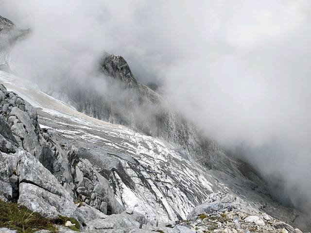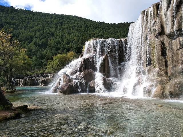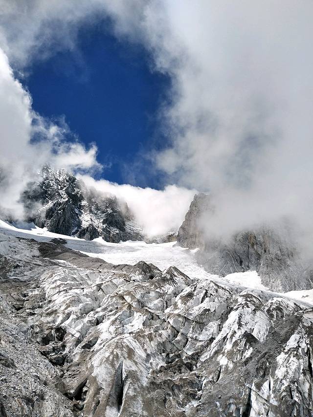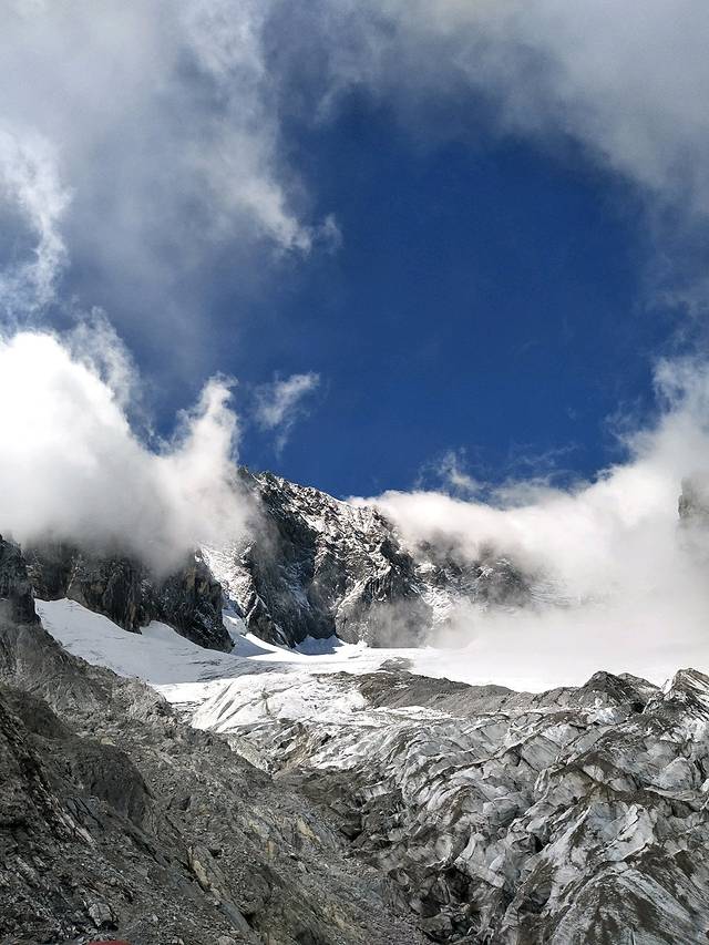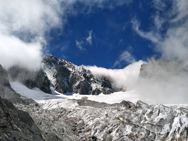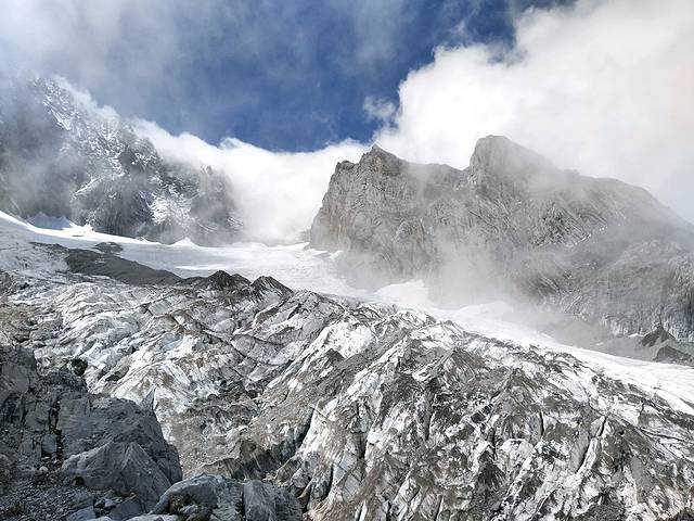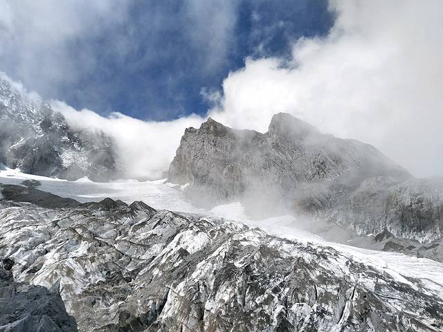 上午7时我们前往古城南门等待大巴车来接我们。今天前往的是离赤道最近的雪山——玉龙雪山。我们很早之前已经在淘宝团购了玉龙雪山一日游,这团购必须好评,旅程社与玉龙雪山景区合作,借用景区内部的大巴车接送我们这样的散客,直接开往蓝月谷景区,免去我们在服务中心排队的时间。旅程社给我们一小时时间在蓝月谷游玩,预定我们于11时30分乘大索道请往玉龙雪山的冰川公园。这旅程社提供最好的黄金时段前往冰川公园,因为太早或太晚,雪山非常羞涩,用大雾环绕着自己美丽的身躯,只有中午时分才愿意撕开面纱,让众人目睹其美轮美奂的姿态。今天依然是国庆黄金周高峰期,可是我们前往大索道验票处完全不用排队,这让我们非常感激选择这团购,又是一件非常幸运的事。昨天在丽江古城见到满街满巷的游客,以为今天到景区肯定需要排队,可是选择这团购而且运气非常好没有遇到其他旅游团,我们完全无须排队,连导游自己都感叹,我们的运气简直太好了,谁敢奢望黄金周不用排队,可是我们这团就遇到了。我们乘坐缆车前往4506米海拔的冰川公园,一路上雪山被大雾环绕,太阳若隐若现。到达4506米的平台,导游让我们自己决定是否继续挑战剩下的路程,最高观景平台在4680米海拔。也许我们在香格里拉已经适应了高原气候,站在4506米海拔高的平台觉得没有什么异常,就开始挑战那相当于60层的楼梯路程。我们慢慢向上走,因今天是多云天气,雪山被雪白的纱衣遮住,大雾完全没有散去的迹象。在攀登路程中开始出现高原反应,开始出现气喘吁吁与耳鸣,这没有影响我们的热情,我们也不知道支撑我们继续攀登是什么,我们稍微休息一下继续攀登。终于到达了顶端平台,我们就用氧气瓶吸氧,环顾着四周,然后开始拍照。没想到上天仍然眷顾着我们,马上出太阳,雾气开始慢慢散去,露出铺满积雪的洁白冰川,蓝天白云下的积雪闪闪发亮,我们都醉在这无法言喻的美景中。在这时脑子只有一个声音,我们真是被上天眷顾的娃儿啊,很多后来爬上来的游客都没能看到这样的美景,我们是何等的幸运。从来不敢想象这旅程能一直这样幸运,这趟旅程完全没有任何的遗憾。等到团队集中后就回到古城,我们从大水车慢慢走回客栈,并尝试多种云南小吃,慢慢回味着这旅游所遇到的一切。