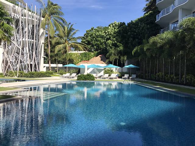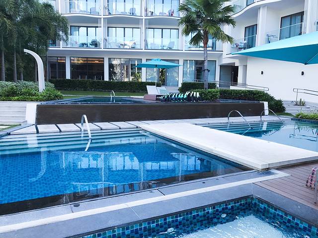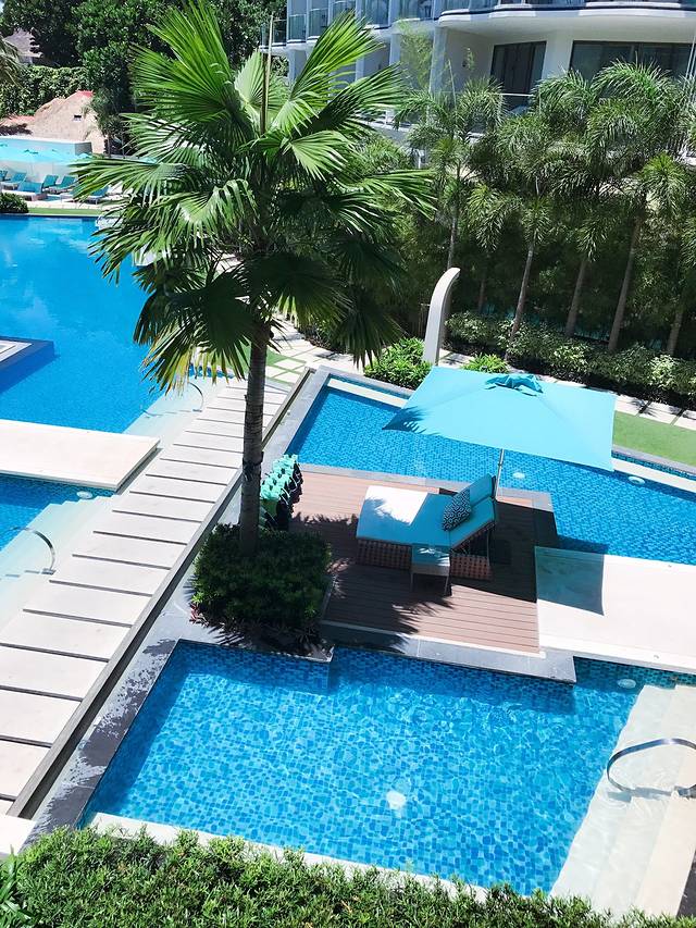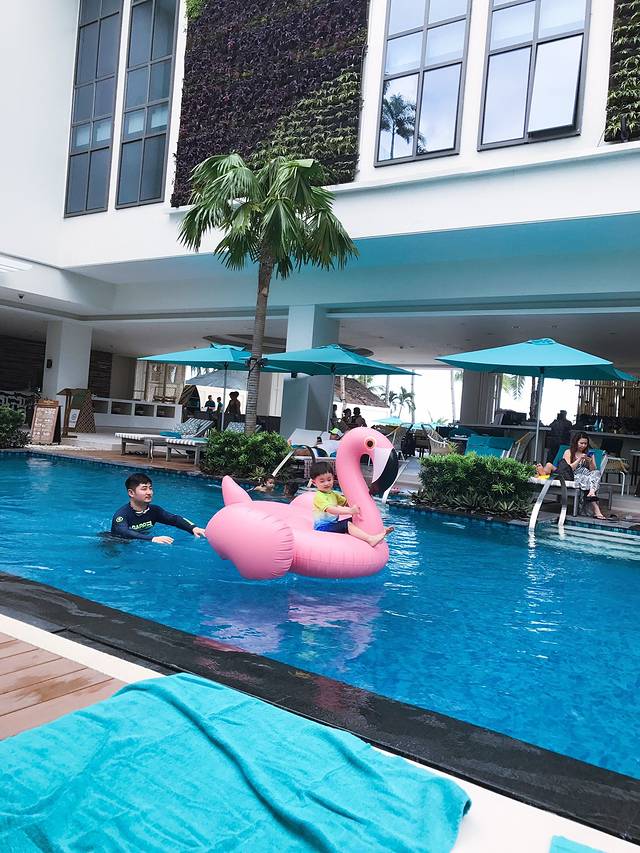 酒店底部的游泳池虽然没有无边泳池的惊艳,但好在晒不到太阳,因此也很受青睐。