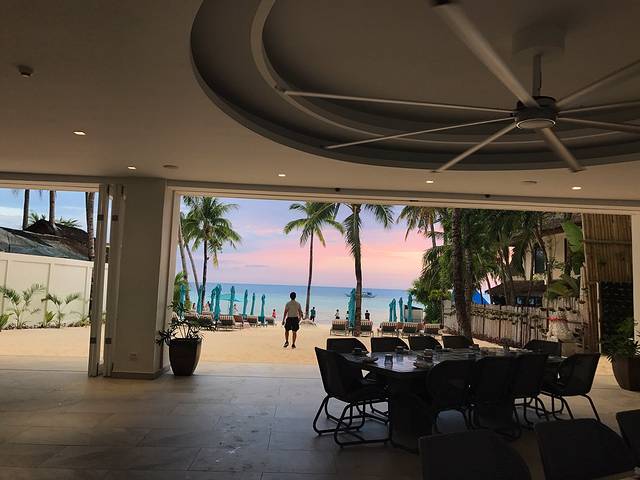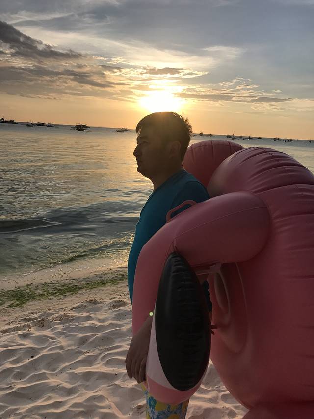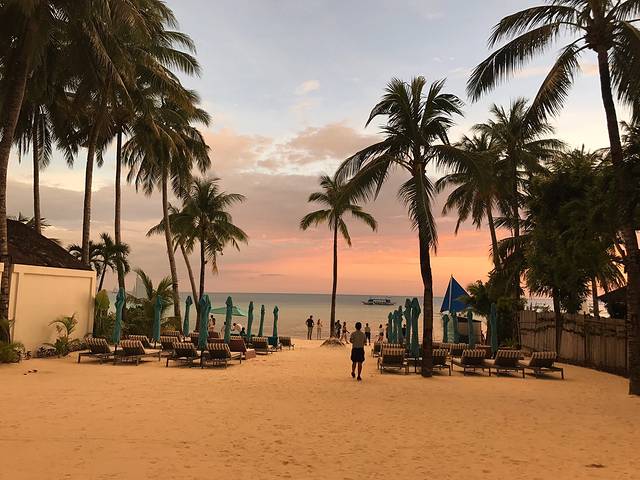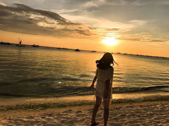休整一下,孩子睡个午觉,去白沙滩玩。酒店的餐厅出门就是星期五沙滩。刚好是夕阳西下时,我们远远的就看了粉红色的落日余晖。在长滩的这几日天气都是好到爆,每天的落日都不一样,但都美到极致!