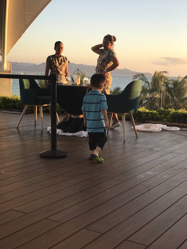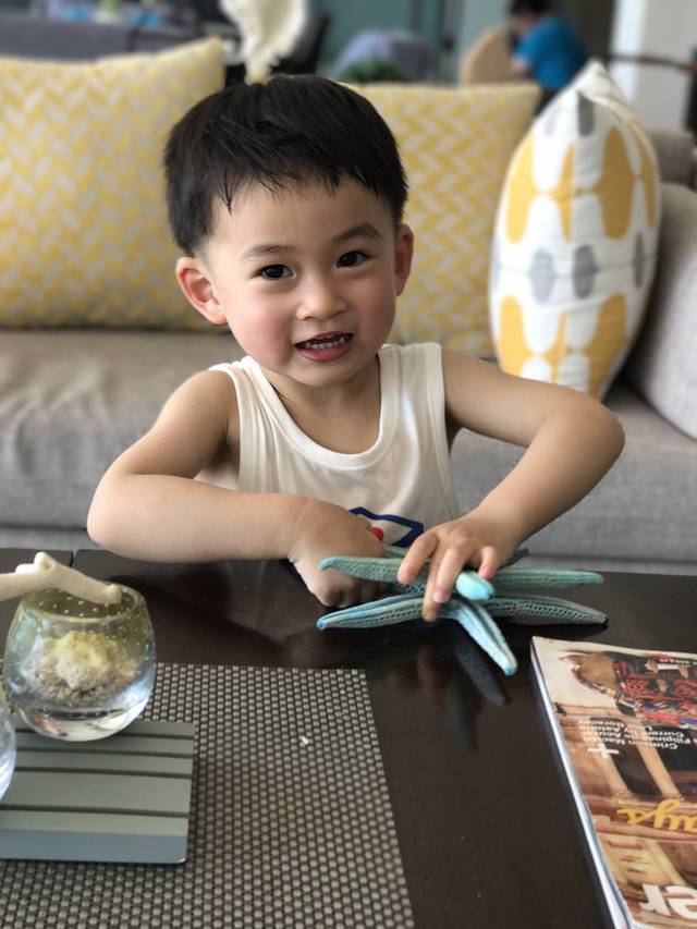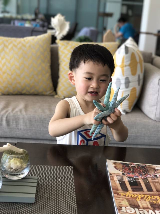小孩子也真的蛮奇怪,一路上都在作,又哭又闹的,到了酒店一下就安静了,大概他也觉得这里非常美吧!桌子上的两个海星被他折腾了半天。