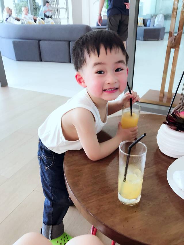 熊孩子终于喝上了心心念念的橘子水。