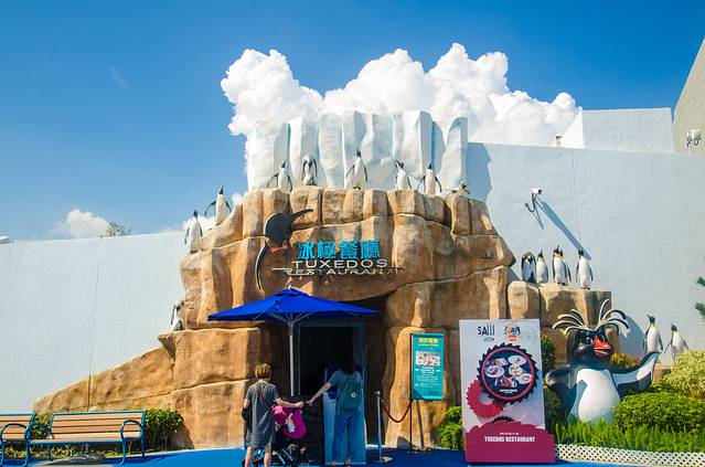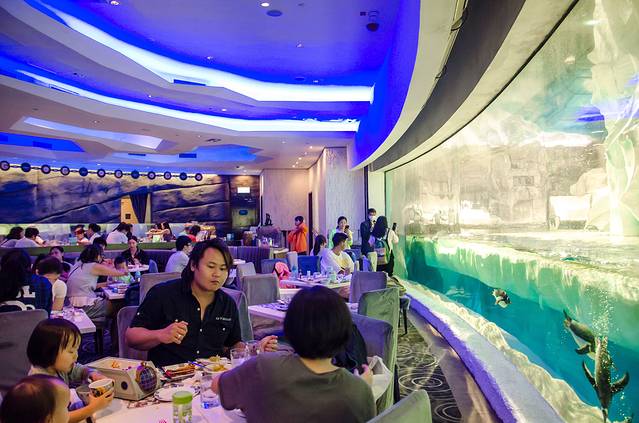 冰极餐厅,位于山顶高峰乐园冰极天地旁,餐厅的墙体纯白就如冰雪一般。走进餐厅内,阵阵冷气扑来,餐厅的内部构造就像是一个冰洞,餐厅的一大特色便是在餐厅就餐就可通过玻璃看到冰极天地的企鹅,一边吃着餐厅精致的菜肴,一边看着企鹅欢快的游泳,别样的享受。