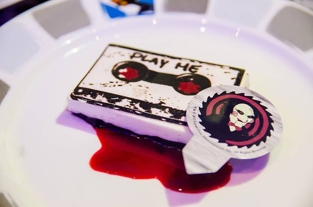椰子竹炭朱古力慕斯,如果你看过电锯惊魂一定对这盘磁带非常熟悉,每一个情节出现都会有磁带来介绍游戏的玩法。餐厅将慕斯蛋糕做成磁带形状,慕斯口感较为细腻,底层的朱古力配上盘子上的果酱,香醇可口。