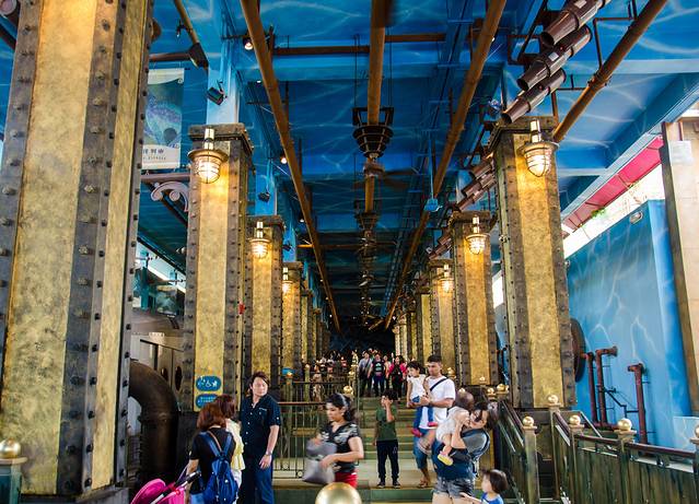 园区分为山下的海滨乐园以及山下的高峰乐园,而连接山上山下有两种交通设施,登山缆车、海洋列车。每一种交通方式都有着自己的特色,由于想要体验山上的城寨惊魂,于是我们先乘坐海洋列车上山,走进海洋列车候车室,复古的建筑风格,让人倍感惊奇。当进入车厢时,头顶的LED屏幕便不断地有播放着高清的海洋世界画面,看着那游动的海龟,就如同乘坐列车在海底穿梭一般。