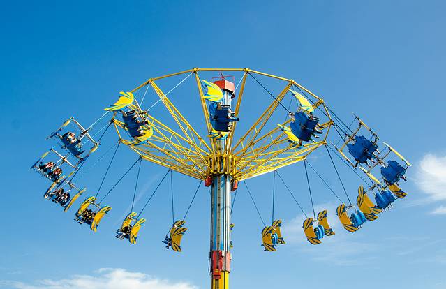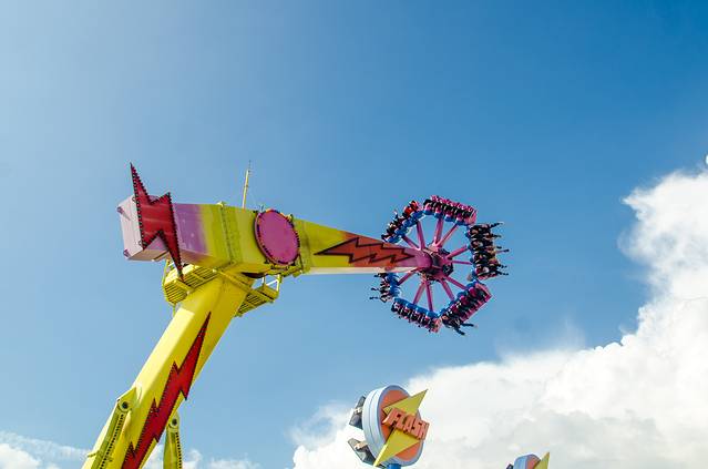 翻天覆地,视觉冲击最为强烈的一个项目,长达十米的摆锤不断摆动,游客的位置随着摆锤的摆动越来越高,直到摆锤到达最高点,所有游客此时都是悬空倒立在二十多米的高空,失重、倒立、悬空、无与伦比的刺激让人忍不住尖叫······