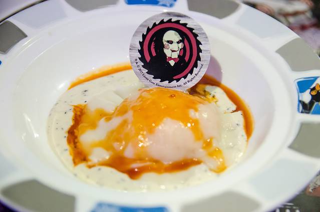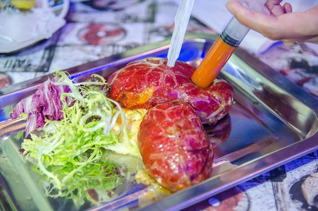 电锯惊魂主题套餐,美食套餐灵感来源于电影电锯惊魂,从前菜、主菜到甜点,每一道都涉及了电影里的元素,独具一格的创意,精致逼真的造型摆盘,不一样的特色,不一样的美味。