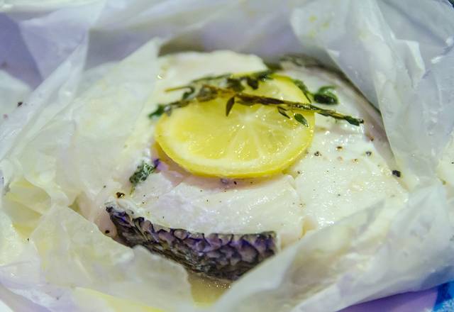 主菜——柠檬百里香海盐焗鲈鱼配白酒汁,和主题最为贴切的一道菜,将海盐巴制作成电锯惊魂的主角面具,用一同端上来的锤子敲开盐巴,便露出了用纸包住的鲈鱼了,打开纸,几种美食融汇的香气扑鼻而来。