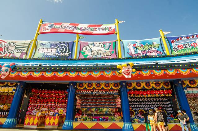 乐园里还有其他各式各样的娱乐设施,相比动感快车那些刺激的项目,这一些显得更为休闲娱乐。大多数都是考验游客的准度,准度越高奖品越丰厚,奖品大多数都是海洋公园的吉祥物。