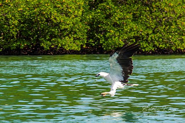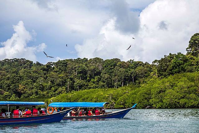 当船驶入被红树林围绕的水域,船夫把引擎熄掉,并拿出鸡皮和内脏往海面上撒,成群的老鹰突然出现并在空中盘旋,然后冲向海面捕食。