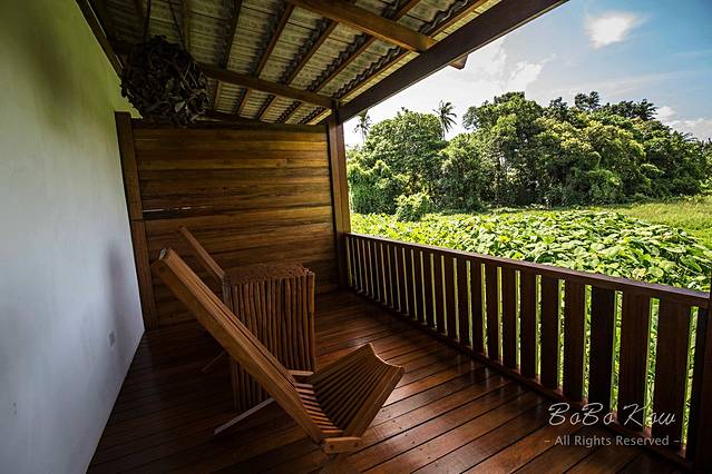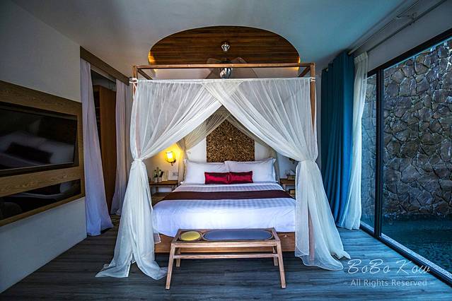 卧室里的大床加上纱幔非常浪漫。晶莹剔透的私人透明泳池旁是开放式的客厅,饭厅和厨房。别墅还带一个拥有田园风光的大阳台,绝对可以让人乖乖的在这待着。