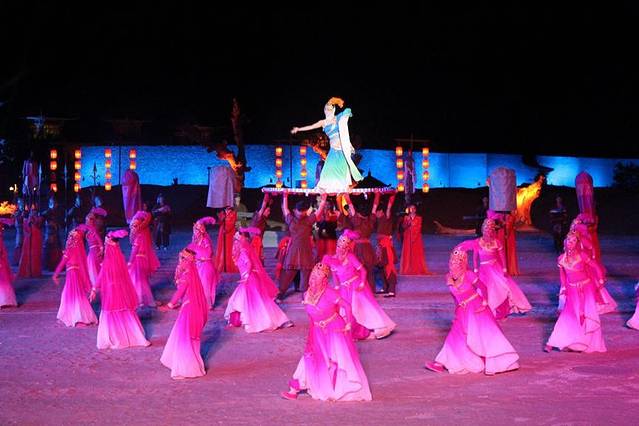 尤其是中间有一幕,一阵又一阵的鼓声传来,像是玉珠砸在盘子上的声音,比起以往听到的雄壮,里面多了一丝爽利。一些舞者手举鼓面,衣着华丽的舞者站在上面应鼓而动,精准的踩住鼓点,长袖随之舞动,当真是“带垂钿胯花腰重,帽转金铃雪面回。”,让人一瞬间想到了能在掌上起舞的赵飞燕,只是眼前的舞多了几分异域特有的爽朗和洒脱。