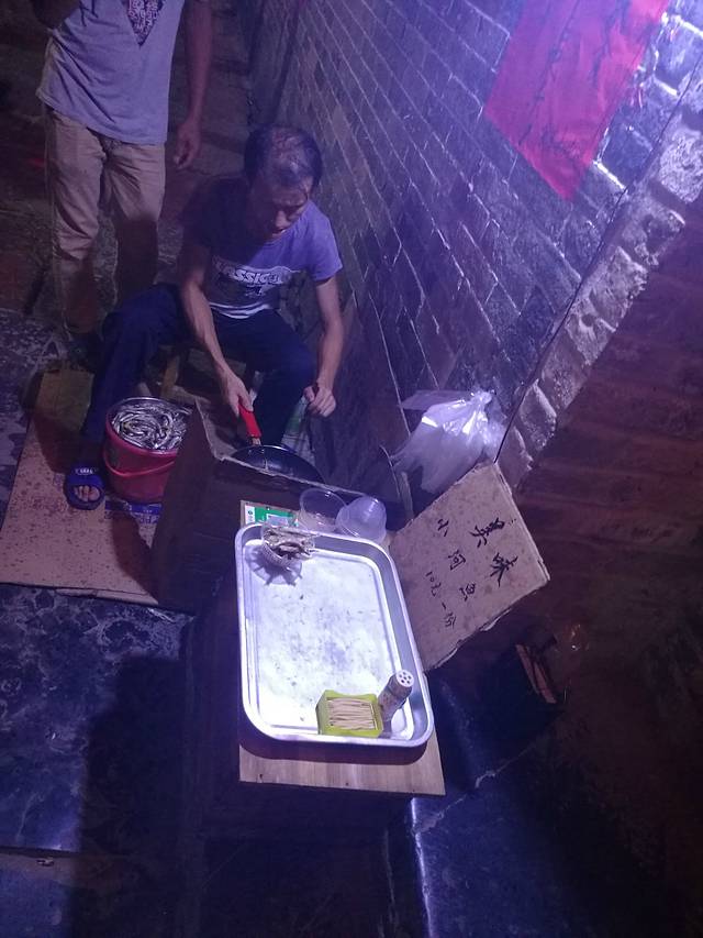 古镇晚上很热闹,小道上很多卖东西的,还有很多人卖现场油炸的小河鱼,10块一份,味道不错。