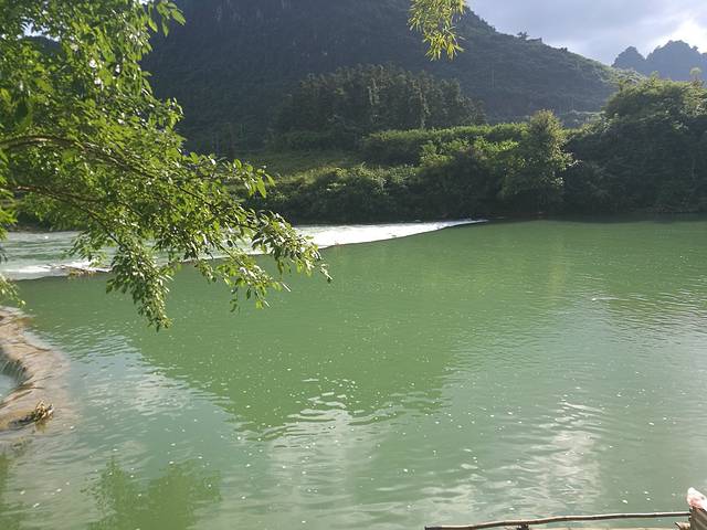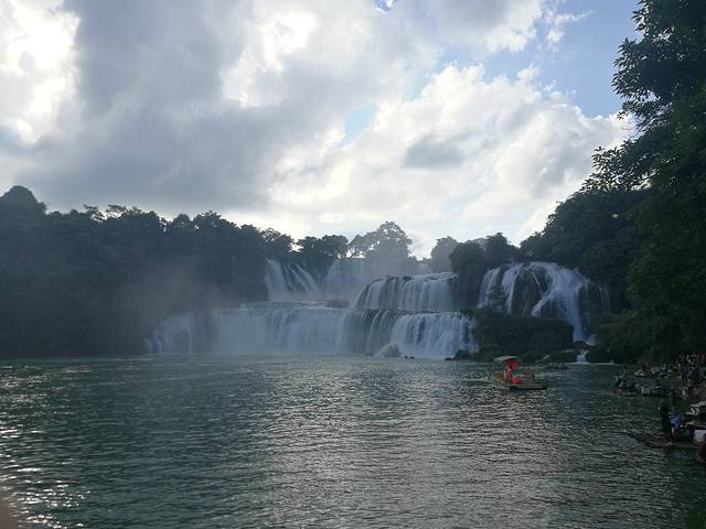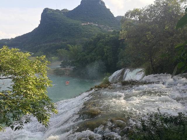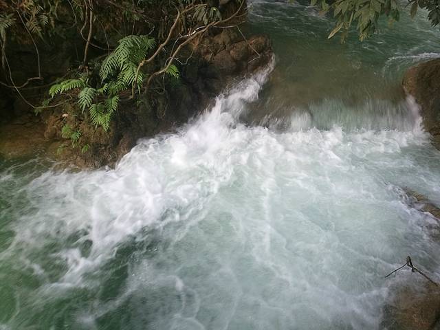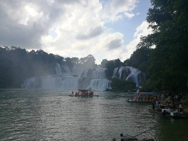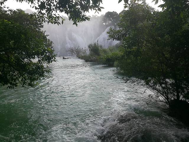 沿着人工搭建的小道一路往下走,不得不说,还是很美的,大自然的美有时候真的很让人陶醉。我们一路走,还没看到大瀑布,开始看到的只是归春河。水很美,看起来就像是一块璞玉,在阳光的照耀下更是闪闪发光。再往下走,就是河边了,已经能看到气势磅礴的大瀑布了,本姑娘第一次看见瀑布,心情真是十分激动,还想着怎么给大瀑布拍个大特写啥的。但是这个景区真的很让人讨厌,什么都收费!!! 真的!!!你想拍大瀑布的正面吧,必须得坐船,坐船还能去到对面的小岛,据说就是越南的地带了吧。然后我看到有个观景台,我就很高兴地拉着然然去,然而那个观景台门口写着10元/1人。当时真的就是没啥心情了,我就拍个照片哎,不用这么坑吧。后来我们就只是拍周边的风景啥的了,知道坑钱,但是没想到处处都是坑。。。(摊手)看完大瀑布,其实已经是没什么看的了,我们跟着人群继续往前走,刚才我们是走下来的,现在我们得往上走了,靠大瀑布往上走,可以看到水流一泻而下,当然了,免不了会被喷一身水花,很凉爽噢。再往上走就是什么风情街了,但是没什么意思,就是卖一些民族小玩意,这东西我见多了,所以一点儿也不稀罕。听人说有个越南酸奶很好喝,我们就买了,10块钱4盒,刚好够分。味道还不错吧,有草莓味,百香果味和芒果味,但是我觉得是没有什么很特别的,跟国内的酸奶几乎差不多,而且量很少,两三口就没有了。走到风情街已经是看的差不多了,再走就是出口了。这个出口我觉得应该也是一个入口吧,大家再来玩的可以从这个门进啊,这个门口出去有好多旅馆跟吃的,我还看到有停车场。这边进去就离着瀑布没那么近,但是其实也不远,关键是不用浪费那45块的观光车费啊。