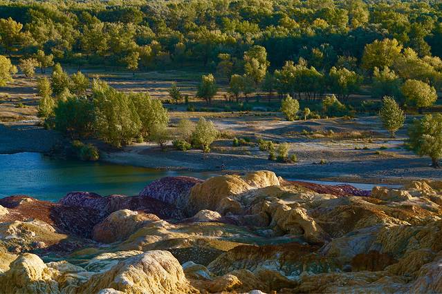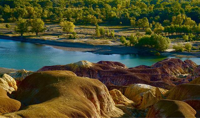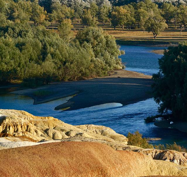 五彩滩,毗邻碧波荡漾的额尔齐斯河,由于水流冲击以及狂风侵蚀,形成了北岸的悬崖式雅丹地貌,河岸岩层抗风化能力强弱不一,轮廓便会参差不齐,而岩石含有矿物质的不同,又幻化出种种异彩。而南岸却是绿树葳蕤,连绵成林,一河两岸,遥相辉映,远处逶迤的山峦与戈壁风光尽收眼底。这就是五彩滩,斑斓的色彩,绿树流水的环绕,无疑是丹霞地貌中的天堂。