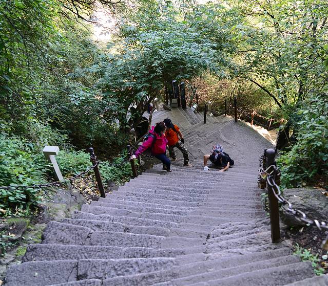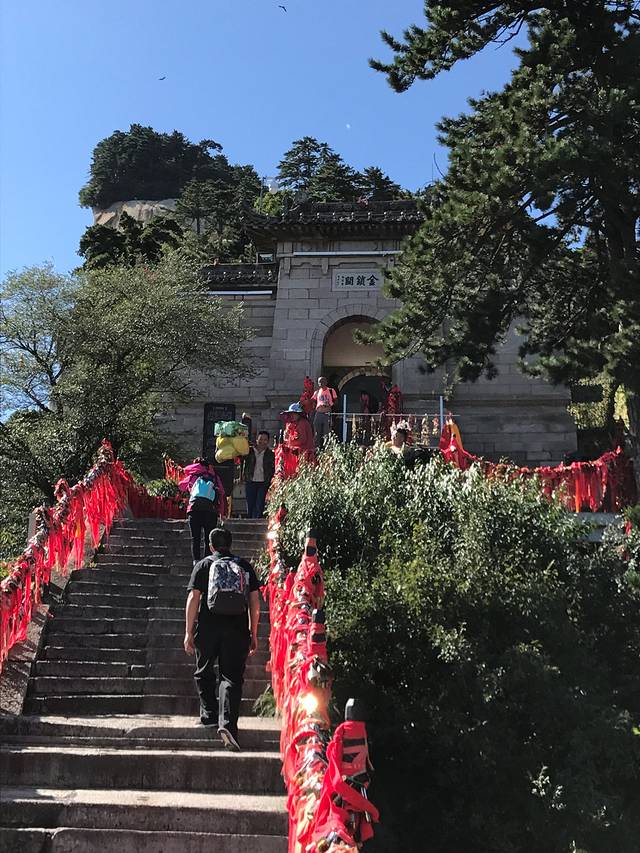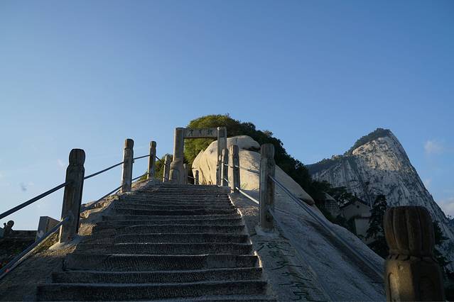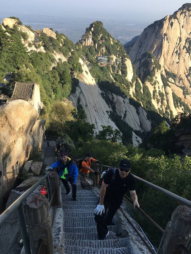 最传统的徒步登山路线是从玉泉院开始的,“自古华山一条路”,我们是从一点钟开始登山,爬到北峰已经是早晨六点了,如果体力好的人,六点钟应该可以到达东峰的观日亭看日出,现在我们只能在北峰看了。