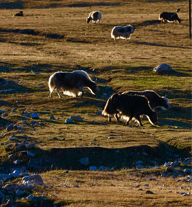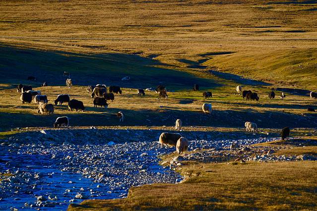 路边一片草原上牛羊在静静的吃草,昔日的余晖,把它们的毛发照的金光闪闪。