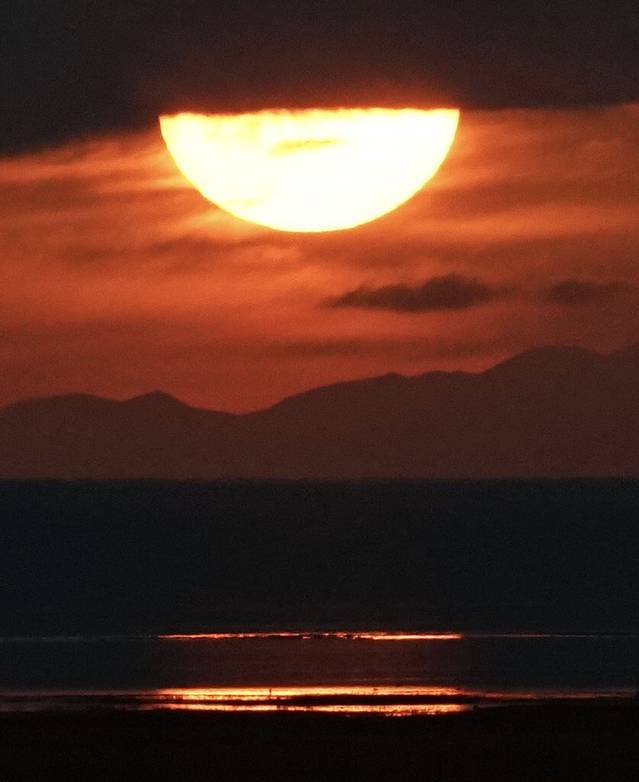 天边开的一条窄窄的缝,太阳出来了,只几分钟的时间,太阳就升到上面的黑云里去了,虽然没有满天的彩霞,但还是很壮观。