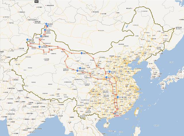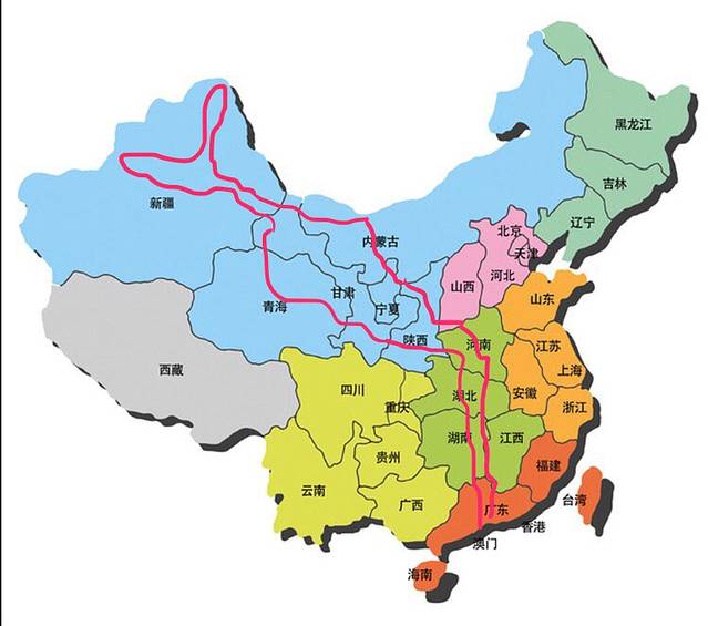 从佛山出发,往返依次穿过18个省(自治区):广东~湖南~湖北~河南~陕西~甘肃~青海~甘肃~新疆~甘肃~内蒙~宁夏~陕西~山西~河南~湖北~湖南~广东,总里程,12300公里,几乎就是地球直径(12700公里)的距离。