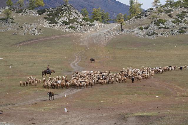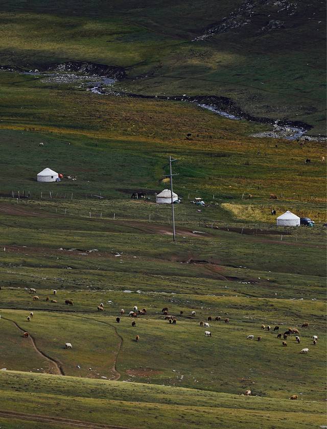 道路经过草原,蒙古包散落在草原上,大群的牛羊在休闲地吃着草。
