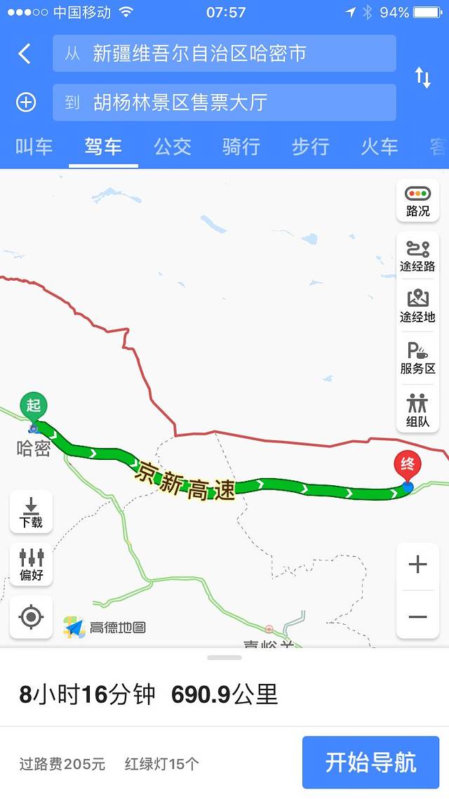 我们走的除了高速公路就是国道,路况都很好,开小车去一点问题都没有,就是限速比较低,很少有120公里限速的,都是80/90/100有的地方还是60/70而且有很多地方是区间测速,你根本就超不了,最要命的是路很直,一直伸向天际,看上去一台车都没有,人也没有,但是你就是不能开快,搞的你郁闷的要死。现在的导航非常给力,设定的两个点以后他可以给出一个到达的时间,这个时间我们发现基本都很准,给我们计划行程带来不少的方便,但是另一个问题又来了,进入甘肃、青海、内蒙和新疆几个省,基本上是没有4G网络的,有时候3G也没有,有的路段直接就没有信号,这样就会在路途中规划住宿和下一站的行程带来很多的不方便,所以最好晚上住店的时候就要规划好明天的行程。
