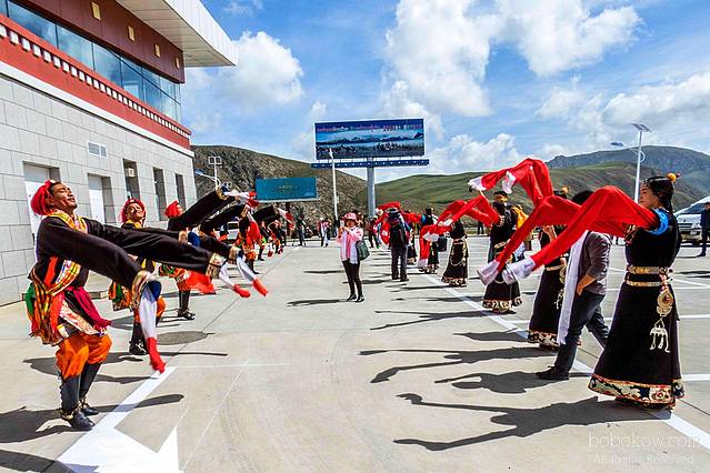 航班降落在玉树机场时我被周围的景色惊呆了。 玉树机场的景色是我见过最漂亮的机场。 牦牛群散落在广阔的草原上,草原被雪山环绕。走出机场大门,一群穿着藏族传统服装的朋友已经迎上来为我们献上哈达和敬上一杯青稞酒。舞者给我们献上欢迎舞。