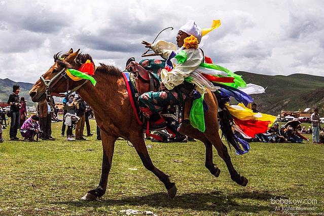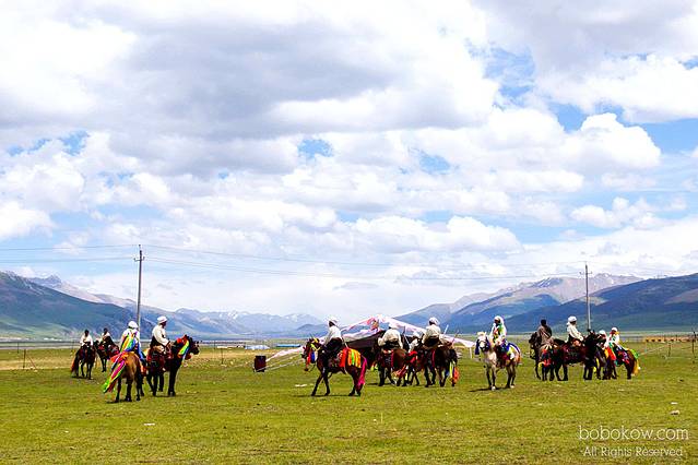 蓝天白云下在巴塘草原欣赏康巴汉子马术表演。赛马是康巴藏族非常重要的活动,在所有庆典都不能欠缺。
