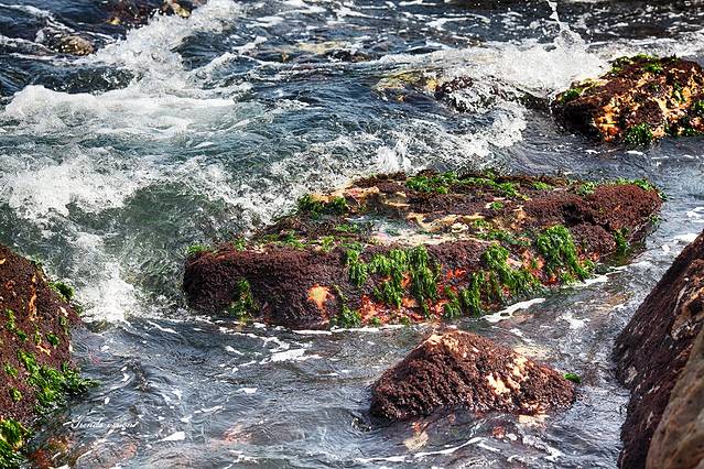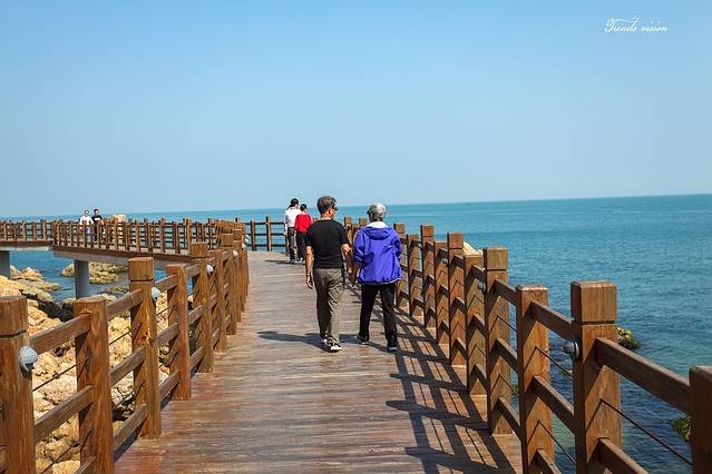 逛完惬意的海滩,往南顺着大海走,就是足足有1公里长的木梯栈道,部分栈道底部是用玻璃做的,栈道离地大概有5米多,走上玻璃栈道脚下是礁石大海,脚下的海浪冲击着海岸上的礁石,水中竟然还有小鱼游弋,很美的。