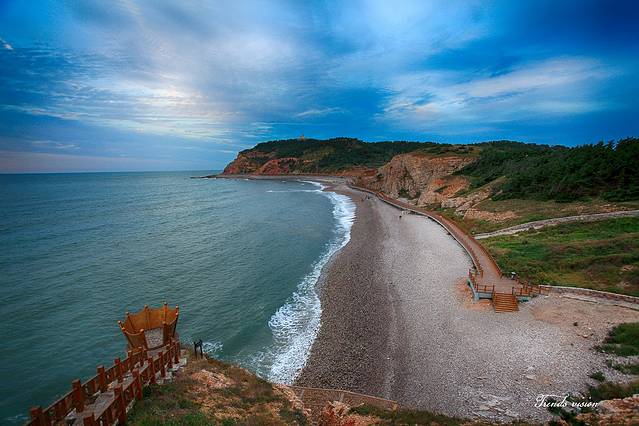 月牙湾景点跟九丈崖其实是一体的一个景点,顺着黄红蓝色的道路,可以从一个景点到另外一个景点,好像在山东的各个旅游区,半月形的沙滩到处都有,来到长岛仍然不例外,月牙湾。呈半月状的球石海滩,向北是一望无际的大海,在大风的吹动下,海水打在岸边的石头上激起了很大的浪花,水雾随着风向飘向空中,打的相机的镜头上都是水珠。
